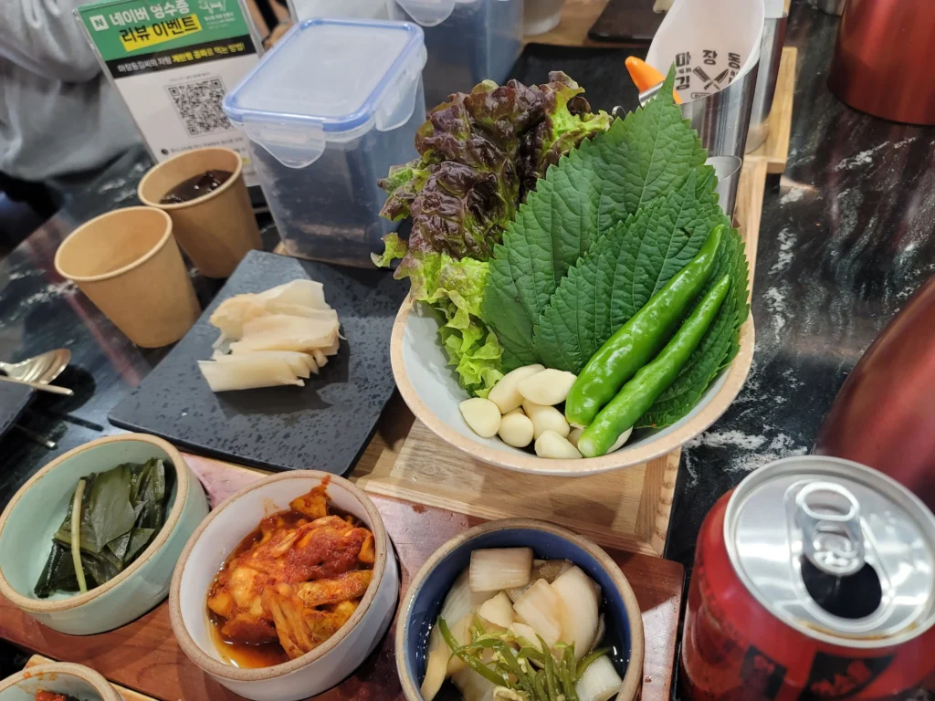 - 밑반찬들과 고기를 곁들여 먹는다.
